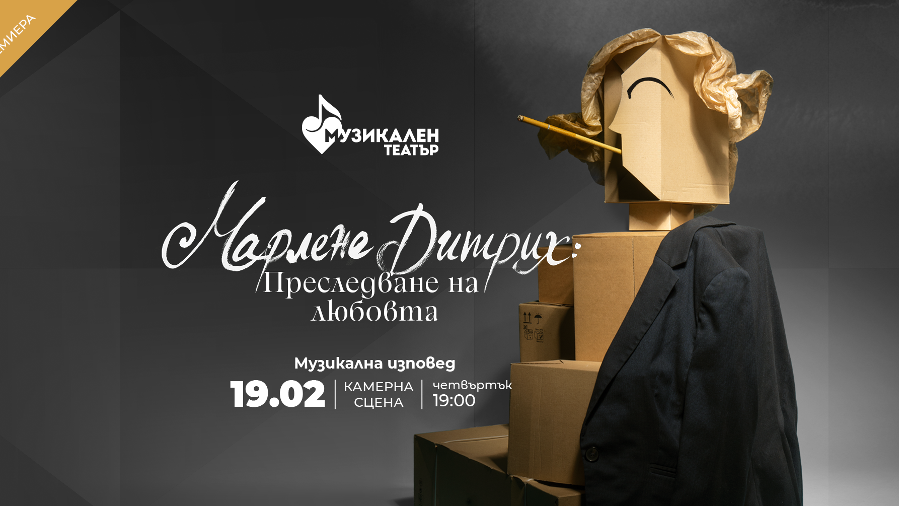 Националният музикален театър ще премиеризира музикалната пиеса „Марлене Дитрих: Преследване на любовта“ на 19 февруари, четвъртък, в 19.00 часа на камерната сцена. Либретото е вдъхновено от пиесата „Марлене се мести“ на Томас Шендел и е посветено на известната кинозвезда Марлене Дитрих. В представлението ще звучат песни от нейния репертоар, интегрирани в личен разказ. Режисьор на спектакъла е Иван Панев, а музикален ръководител е Дориан Молхов.