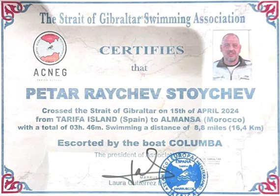 Сред рекордите е и името на Петър Стойчев като първия българин, преплувал протока Гибралтар по правилата (с текстилен бански, без неопрен).