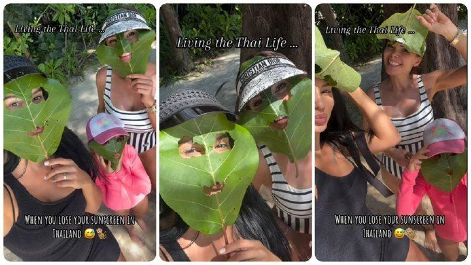 Странният вид на фолкпевицата не е част от ново видео или някаква приумица, а е просто забавно решение на неочакван проблем. Оказва се, че женската банда, която се наслаждава на слънчевите плажове в екзотичната страна, е забравила лосиона си за слънце. Изглежда всички разчитат само на едно средство и нямат откъде да вземат ново, затова веднага прибягват до план Б.