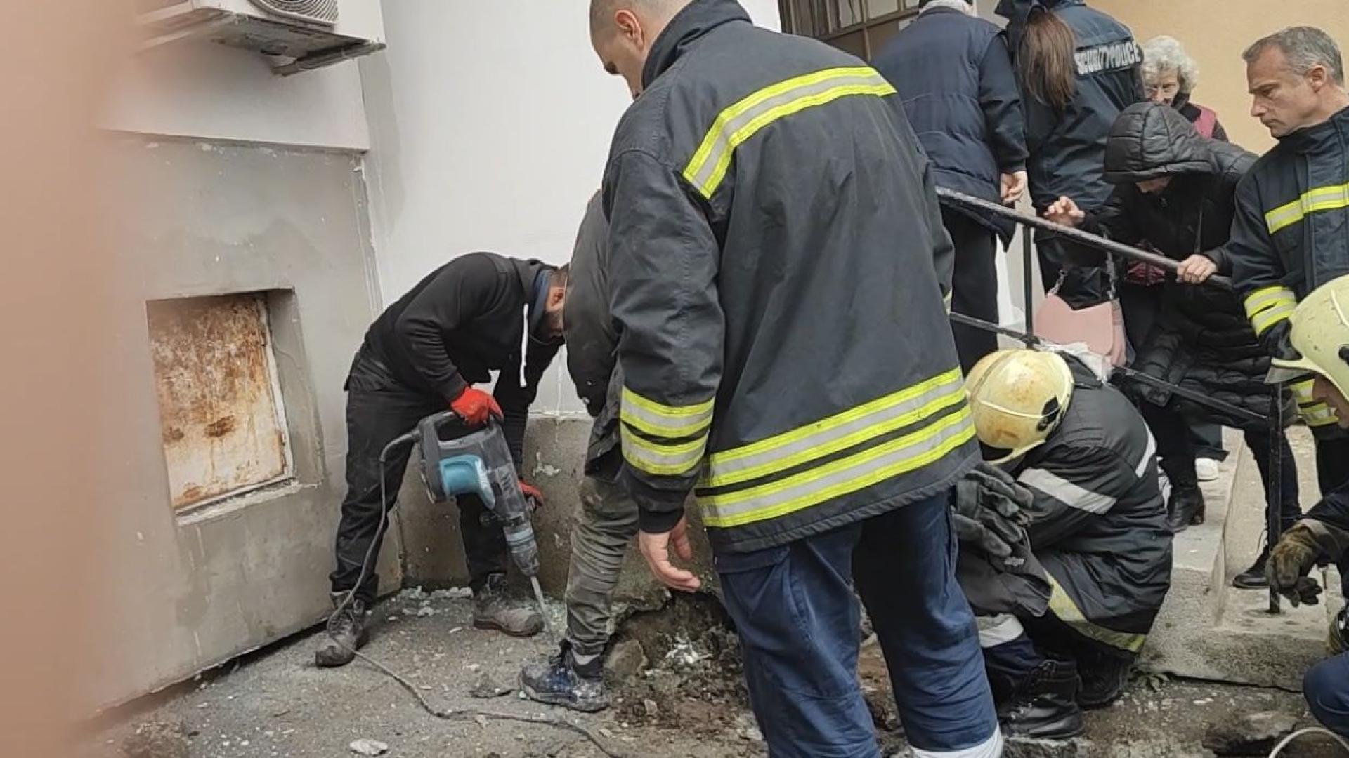 Строителната фирма, която извършва ремонта, е започнала действия за спасяването и котето е било освободено.